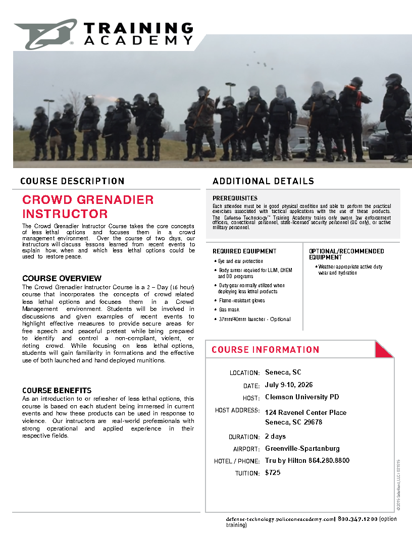 If they are registering for both Grenadier for Crowd Management and the 3-Day Crowd Management/Mobile Field Force they will receive a discounted rate of $1,175